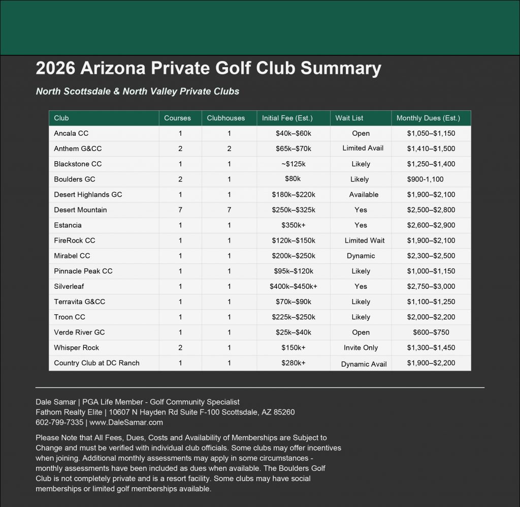 Please note not all the clubs are located in Scottsdale – There are some that are in neighboring communities such as Anthem, Carefree, Fountain Hills, and Peoria but all offer similar high-end private club golf experiences. Please reach out to Dale Samar for more information on many of the subtle differences that clubs may offer. Dale is a life member of the PGA and Golf Community Specialist. He has lived in the Valley for more than 36 years and also knows where the best daily fee golf courses are located. There are many options for golf in the Phoenix Scottsdale areas. Dale can help you find the best location to fit your golf needs.
